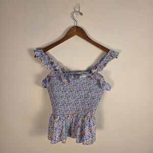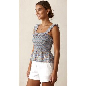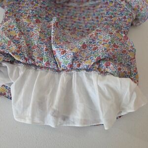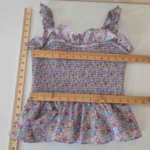 J.Crew smocked peplum top crafted with iconic Liberty Fabric in a vibrant multicolor floral print. This 100% cotton piece features a fully smocked bodice for a comfortable, stretchy fit, complemented by ruffled shoulder straps and a ruffled neckline. The peplum hem adds a feminine silhouette, and the interior is partially lined for quality. Perfect for a cottagecore or summer garden aesthetic.