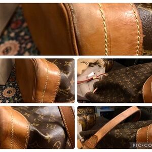 Louis Vuitton Noe GM. In good/fair condition. Scuffs on bottom corners, water spots on leather and bottom of the bag. Leather has darkened more on top opening rim. Shoulder strap in good/fair condition. However, there are dark marks from the hardware buckle on the strap. There are a few pin size cracks on the monogram canvas underneath the leather top trim. You have to look REALLY close to find them. No cracks on the leather top trim. Inside there are several pen marks and need cleaning. White dust from the baby wipes I used to wipe the inside is present. Heat stamp on strap is faded and difficult to read, but posted two pictures. Vintage odor, but nothing offensive. Comes from smoke free home. Please look at all pictures posted of the issues I stated in the description. Date code: AR1125