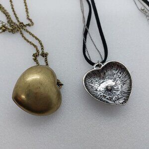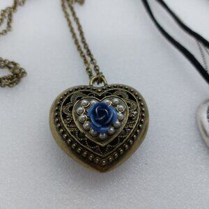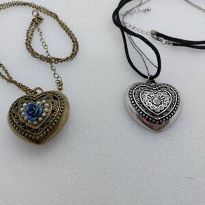 2 Heart Necklace Bronze or Brass Tone Blue Flower & Silver Tone Clear Stones
