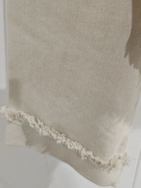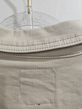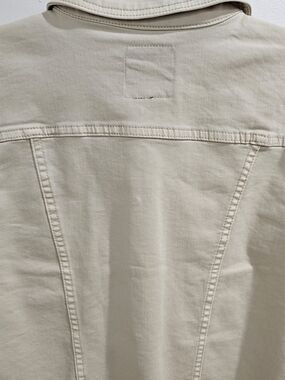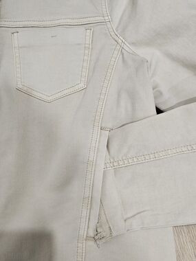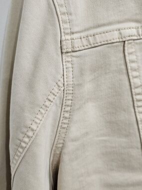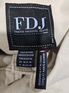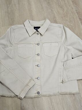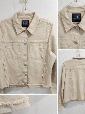 FDJ Cropped Denim Jacket M Beige Frayed Hem Stretch Button Front Casual Chic
