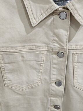 Chic neutral cropped denim jacket by FDJ (French Dressing Jeans) in a versatile beige tone. Features a flattering structured fit with slight stretch, button front closure, chest pockets, and subtle frayed hem for a modern edge.