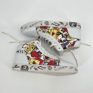 Make a statement with these eye-catching Bass3D high-top sneakers, where art meets urban edge. A vibrant graffiti print adorns the sides, featuring bold graphics of playing cards, dice, and edgy street art motifs, all set against a crisp white canvas. These sneakers are perfect for adding a pop of personality to any casual look, complete with a comfortable fit and durable sole for all-day wear. Wear them to a casual night out with friends, at an art gallery opening, or while exploring the city streets to show off your unique sense of style.