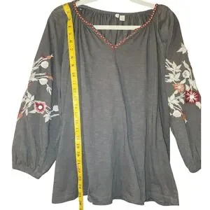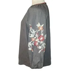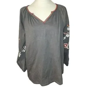 Cato Gray Floral Embroidered Long Sleeve Peasant Top Cotton V-Neck Blouse M