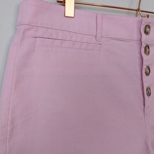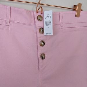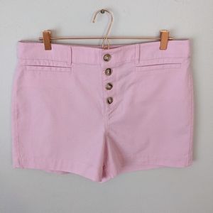 These effortlessly stylish and polished button-front shorts are totally modern and endlessly flattering. Button fly, belt loops, front welt pockets, back patch pockets. Nice sturdy feel to material, but lightweight at the same time. Size 14: waist side to side 19, front length 15.5, back length, 16, inseam 4. Size 10: waist side to side 17, front length 15, back length 15.5, inseam 4.