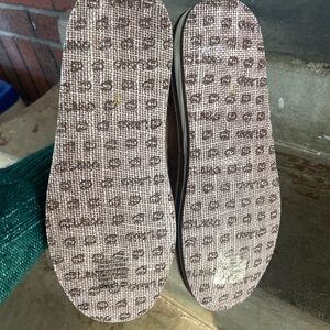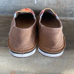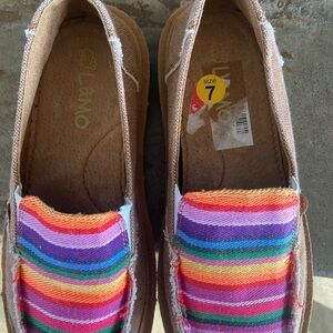 Casual slip-on loafers by Lamo. Brown canvas body with bright multicolor striped vamp. Padded insole for comfort. Lightweight flexible sole. Colorful, easy-to-wear everyday style.