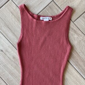Sleeveless ribbed tank dress with a fitted silhouette. Asymmetric hem adds modern edge. Stretchy knit for comfortable wear. Easy to dress up or down.