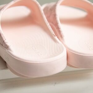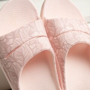 OOFOS OOahh Luxe recovery slides provide unparalleled comfort with OOfoam technology designed to absorb impact and support your arches. These lightweight sandals feature a stylish leaf print on the upper strap in a soft pink hue, making them perfect for post-workout recovery or casual daily wear. These are in excellent preowned condition! Womens size 9.
