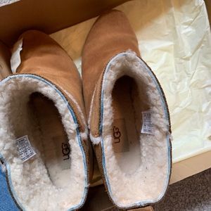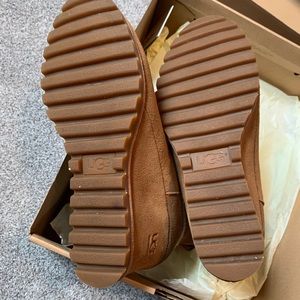 Classic UGG wedge ankle boots. Soft suede upper with cozy shearling lining. Subtle wedge heel for lift. Easy slip-on style with stitched detailing. Versatile fall and winter footwear.