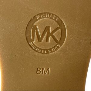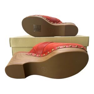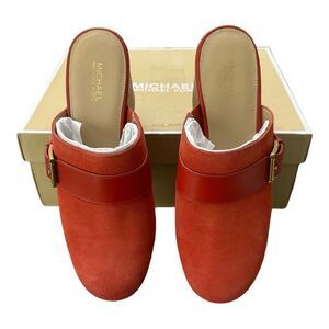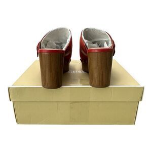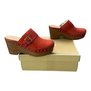Michael Kors women's mules in red suede. Wood-look platform sole with stud detailing. Slip-on clog style with leather strap across vamp. Bold, casual statement shoe.