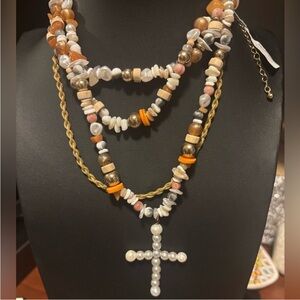 Layered to perfection, this beaded necklace celebrates maximalism with mixed-bead chains and a pearl cross pendant.