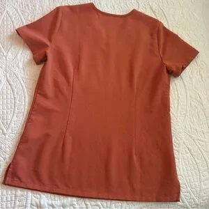 Terracotta scrub top by Figs. V-neck design with short sleeves.