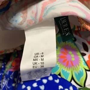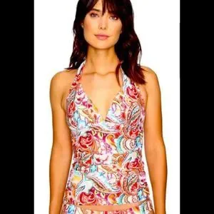 Sunrise tankini. Multi colored. Fully lined. Gold logo on the back. Beautiful bright colors in a paisley print. Ties at the neck for easy adjustment. Soft formed cups. Ruching on the front and tummy control mesh. I love it. .
