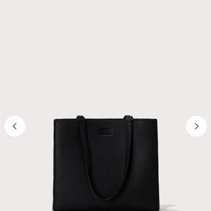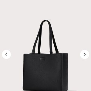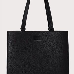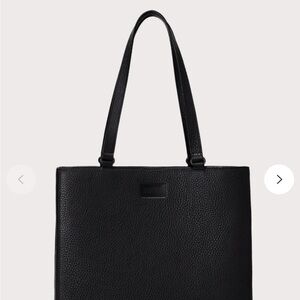 Sleek black tote. Spacious interior. Durable handles. Laptop insert. Water bottle insert. Multiple pockets and zippered pockets. Pen holders. Outside cell phone pocket.