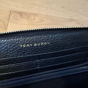 Tory Burch zip-around wallet in pebbled leather. Features embossed logo on front. Gold-tone zipper hardware and a leather tassel pull. Compact layout for cards and cash. Classic, versatile style.