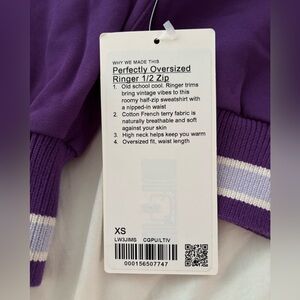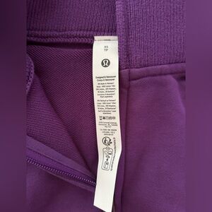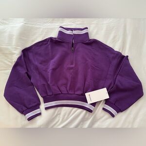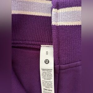 Lululemon purple with light lavender and cream stripes. Soft knit detailing. Casual, versatile layering piece. Recognizable Lululemon logo on tag. Tag Attached. Size: XS. New. Crop Top. Quarter Zip. No Damage. No Stains. Smoke Free Home.