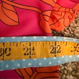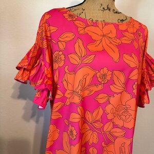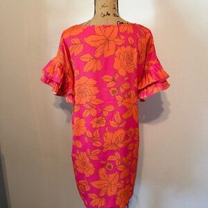 Hot pink and orange floral print dress featuring ruffled sleeves medium