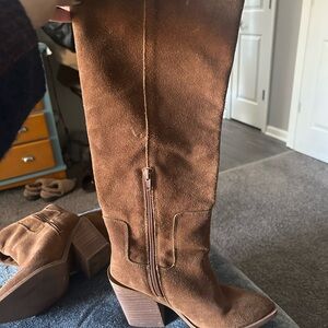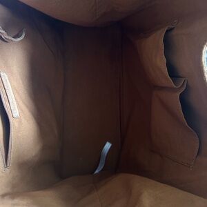 Stylish brown suede tote bag with dual handles and side pockets. Perfect for everyday use.