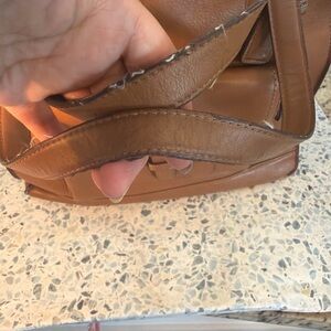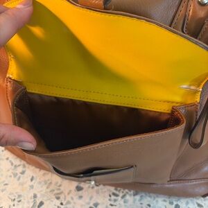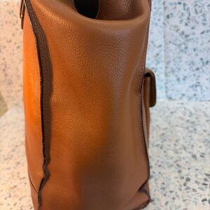 Stylish brown leather tote bag with front buckle pocket. Perfect for everyday use.