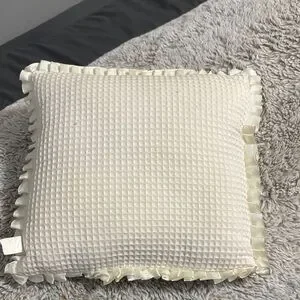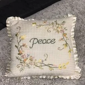 Beautiful decorative pillow with 'Peace' embroidery. Features floral designs and ruffled edges. Perfect for adding a touch of elegance to any room.