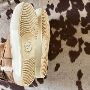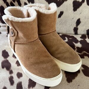 Warm tan suede boots with sherpa. Features a side buckle and UGG logo.