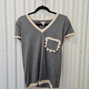 Lightweight gray V-neck tee. Short sleeves with cream trim. Frayed chest pocket for a relaxed look. Soft, casual everyday top.