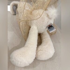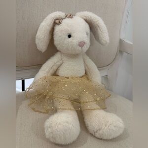 Springing and spinning onto the dance floor, it's Glistening Belle Bunny! This vanilla cream bunny is sugar-sweet in a glittering golden tutu that floats all around! With a satin bow to match her outfit, she's got two dancing paws and she's ready to bounce!