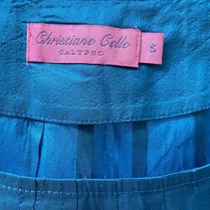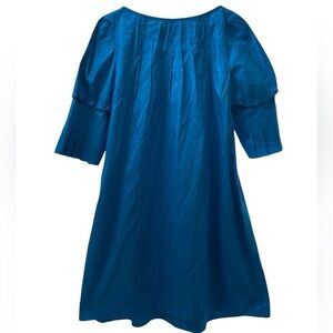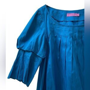 Jewel tone poolside blue. Gathered neckline with quarter length pleated sleeve. Side pockets. 100% silk, unlined.