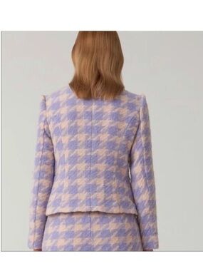 Stylish lavender and cream blazer with houndstooth pattern. Features button details and a tailored fit. Ideal for a polished look.