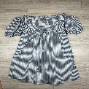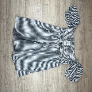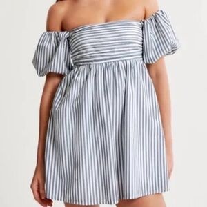 Off-shoulder mini dress with blue and white stripes. Puff sleeves. Elastic bodice for comfort.