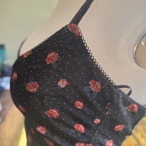 Beautiful rose patterned and polka dotted ruched dress. It's from Unborn Heritage and has a built in slip. I love the gorgeous v-neck chest accentuated with lace and a sheer body, very soft adjustable strap dress with a pinched waist to accent any figure. Never worn!