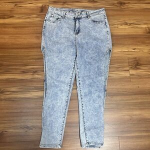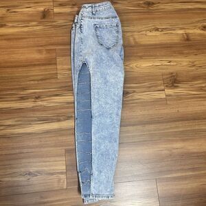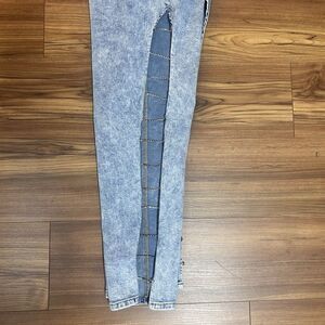 Y2K acid wash skinny jeans featuring bold rhinestone ladder cutout design down the leg. Super eye-catching statement piece perfect for festival, rave, or baddie streetwear looks.