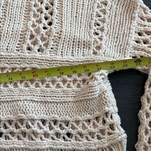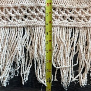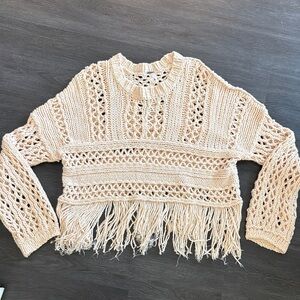 Loose open-knit crochet sweater with textured stitch detail. Fringe trim along hem. Soft crew neckline. Relaxed, breezy silhouette for layering.