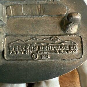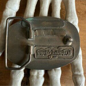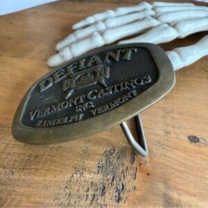 Vintage 80's brass belt buckle for Defiant Vermont Castings Inc. in Randolf VT with a wood burning stove image - date stamped 1982