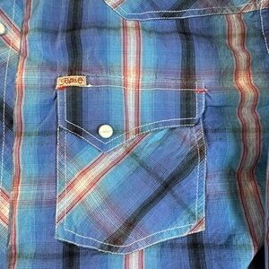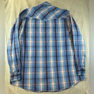 Western plaid shirt with button-snaps down front. Features dual chest pockets. Ideal for everyday wear. Cowboy western ware. This shirt is pre owned but looks