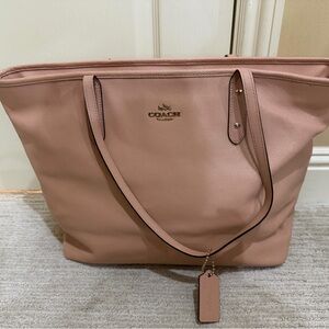 Spacious Coach leather tote in blush pink. Dual top handles for easy carrying. Gold-tone logo hardware adds shine. Clean, structured silhouette for everyday wear.