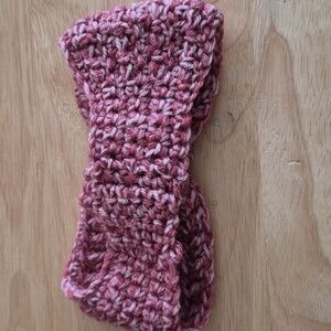 Soft crocheted headband in a dusty rose blend. Features a decorative flower with a pink jeweled brooch center. Stretchy and cozy knit. Stylish accessory for cool weather.