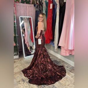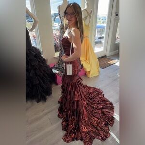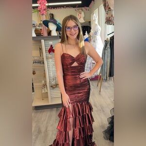 Fierce and fun, style 70959 stuns in metallic net with a ruched bodice, front cutout, and layered ruffle skirt. The thigh-high slit and lace-up back bring the drama, while the shimmer catches every light. Crimson commands attention, and adds a modern twist—perfect for prom, parties, or any moment made for standing out.