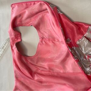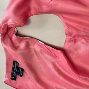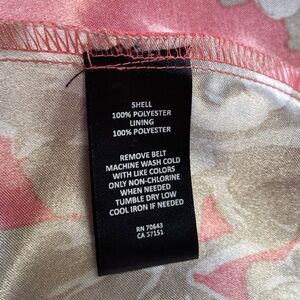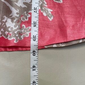 Sleeveless fit-and-flare knee-length dress with a feminine floral print. Fitted waist and pleated skirt create a classic silhouette. Coral base with contrasting beige floral accents. Elegant and wearable for daytime or events. Great condition, but missing the belt.