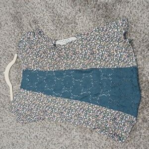 floral top with lace accents. Short sleeves and high-low hem. Soft pink and green floral print.