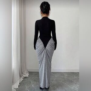 Turn heads in this sophisticated two-tone dress featuring a sleek black long-sleeve fitted top paired with a ruched houndstooth midi skirt. The sharp V-cut waist design creates a flattering, sculpted silhouette that enhances your curves effortlessly.