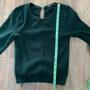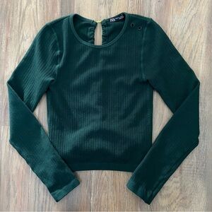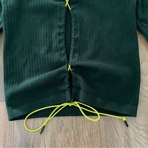 Zara forest green ribbed top with eye-catching open back with neon yellow cord. Cropped long sleeve tee. Ideal for everyday style.