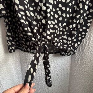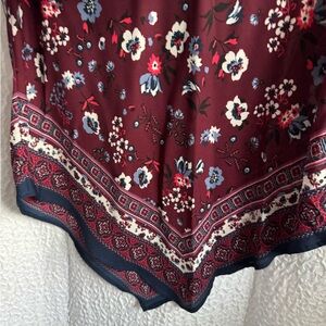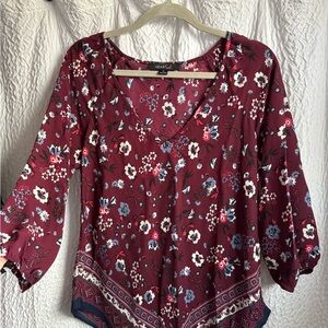 Chic red blouse with black abstract pattern. Long sleeves and elegant design. Kansystore black and white blouse ties in the front. Heart & Soul burgundy floral blouse with ha kerchief front and back. XL bundle includes all 3.