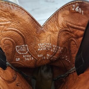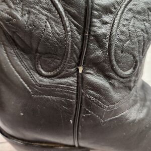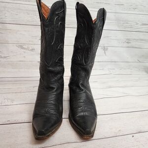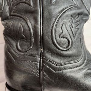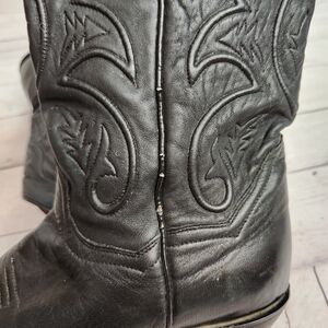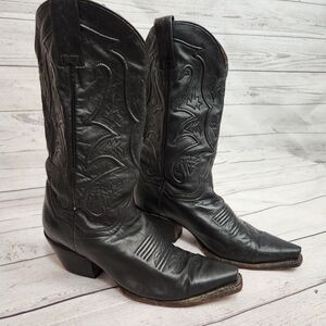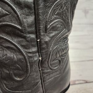 Dan Post women's western boots in black leather. Decorative stitched shaft with classic western motifs. Pointed toe and stacked heel for a western silhouette. Pull tabs at the top for easy on. Timeless cowboy boot style for many outfits. Leather piping on shaft has some cracking.