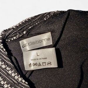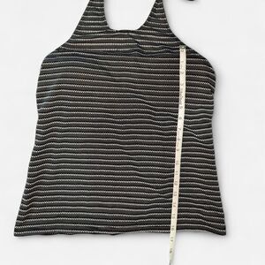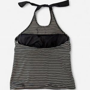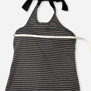Liz Claiborne black and white striped halter tankini bathing suit top with built in bra padding and adjustable tie neck in size WOMENS LARGE. Good gently used condition. No flaws, but does have a super faint scent of chlorine even after being washed.