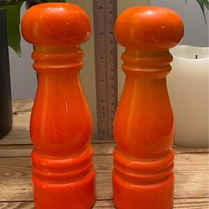 Le Creuset Style, Farmhouse Kitchen, Kitsch, Retro Dining, Bright Orange Kitchen Decor, 60s Kitchenware, Pottery Shakers, Pop of Color, Collectible Salt and Pepper. Cottagecore. Grandmacore.