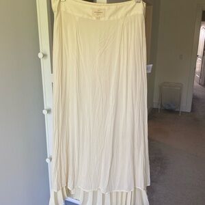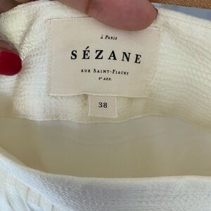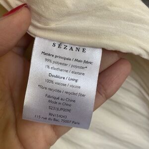 Elegant strapless midi dress by Sezane. Fitted bodice with a flowy pleated skirt. Clean ivory color and timeless silhouette. Perfect for daytime or evening wear.
