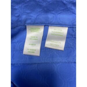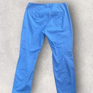NEVER WORN. Beautiful shade of blue and ready for spring! Lilly Pulitzer ankle pants in a vibrant periwinkle blue feature an elegant tonal jacquard quatrefoil pattern throughout. These slim-leg trousers are crafted from a comfortable stretch cotton blend and detailed with a signature gold-tone logo button with rhinestone accents. Designed with a flat front, faux rear welt pockets, and a clean silhouette, they offer a polished look for resort or casual wear.