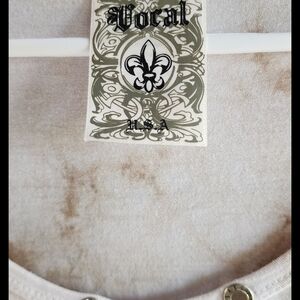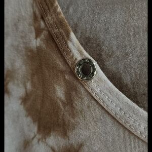 Stylish tie-dye top with fringe hem. Features studded neckline.