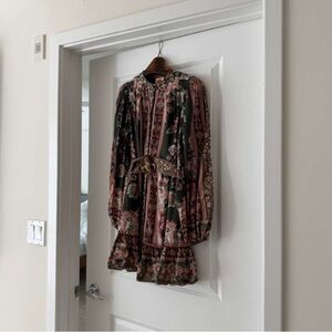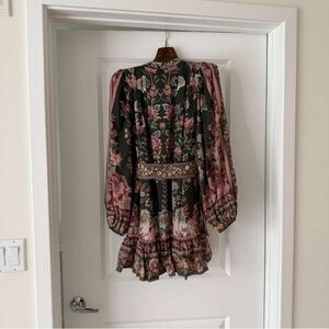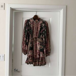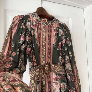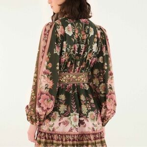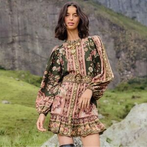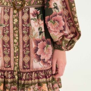 The Green Flowering Garden Tree Mini Dress invites you into a whimsical botanical world with its rich green and soft pink floral print. A structured high neckline complements voluminous puff sleeves, while the cinched waist with a matching belt frames a playful silhouette. Delicate ruffles skirt the hem, adding movement and charm to this enchanting mini dress, perfect for sparkling in sunlit gardens or lively city adventures.