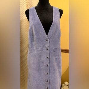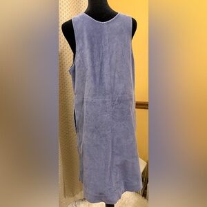 Pre owned. Good condition. Signs of use shown in pictures. Chic sleeveless mini dress in a soft lavender suede. Features a V-neckline and front button closure for an easy, polished look. Lightweight structured fit that flatters the waist. Perfect for daytime or evening styling in lavender.